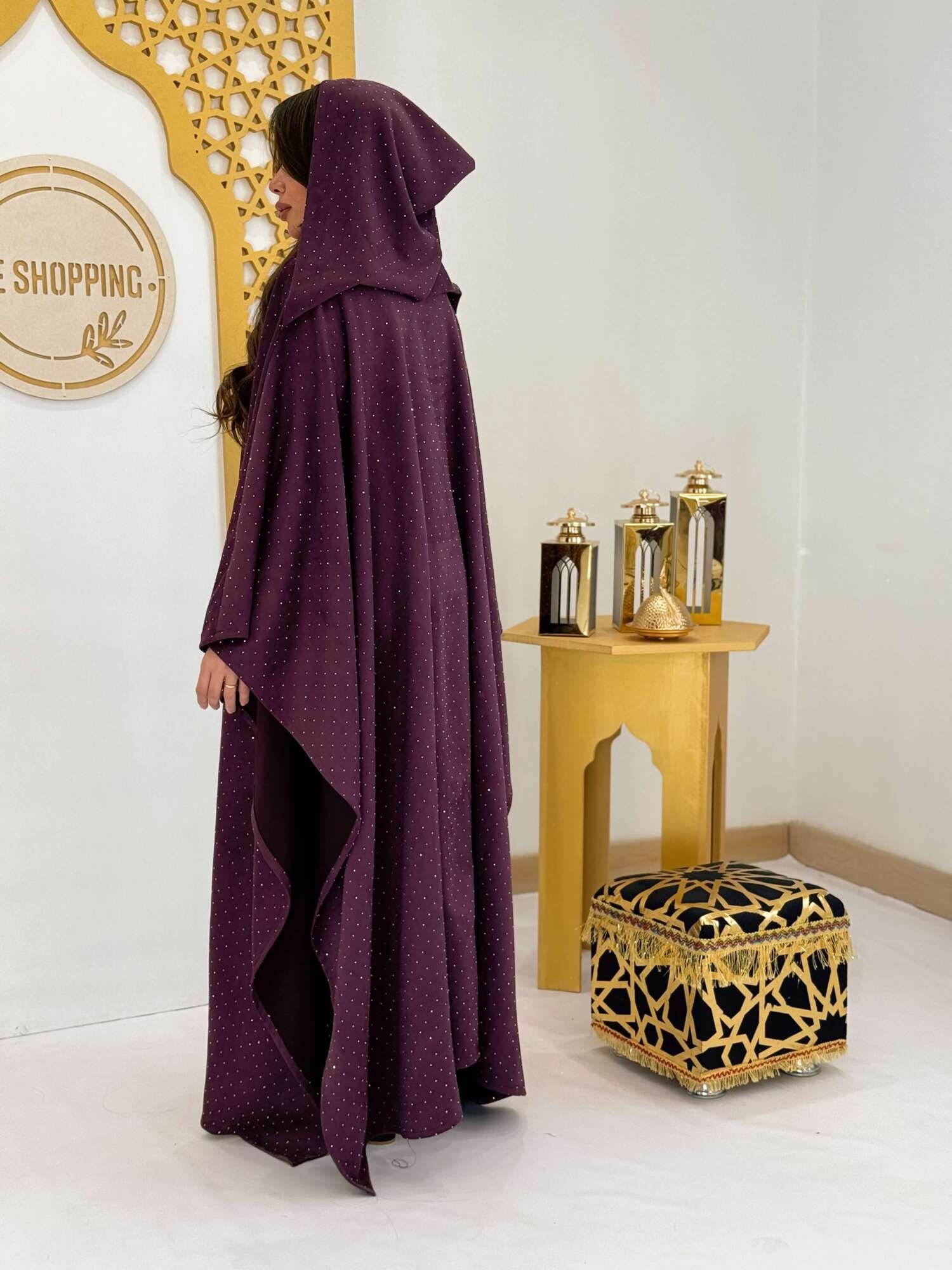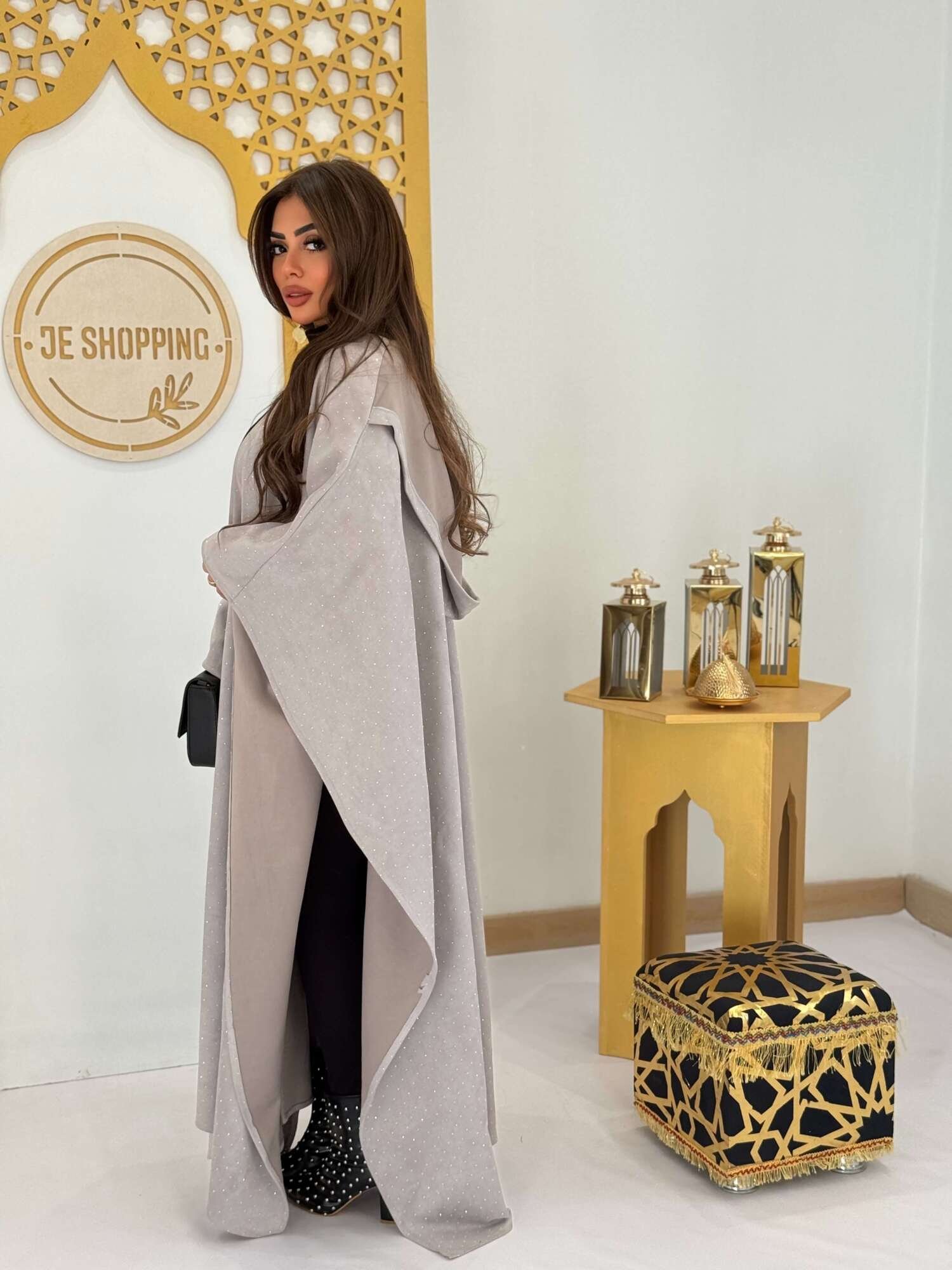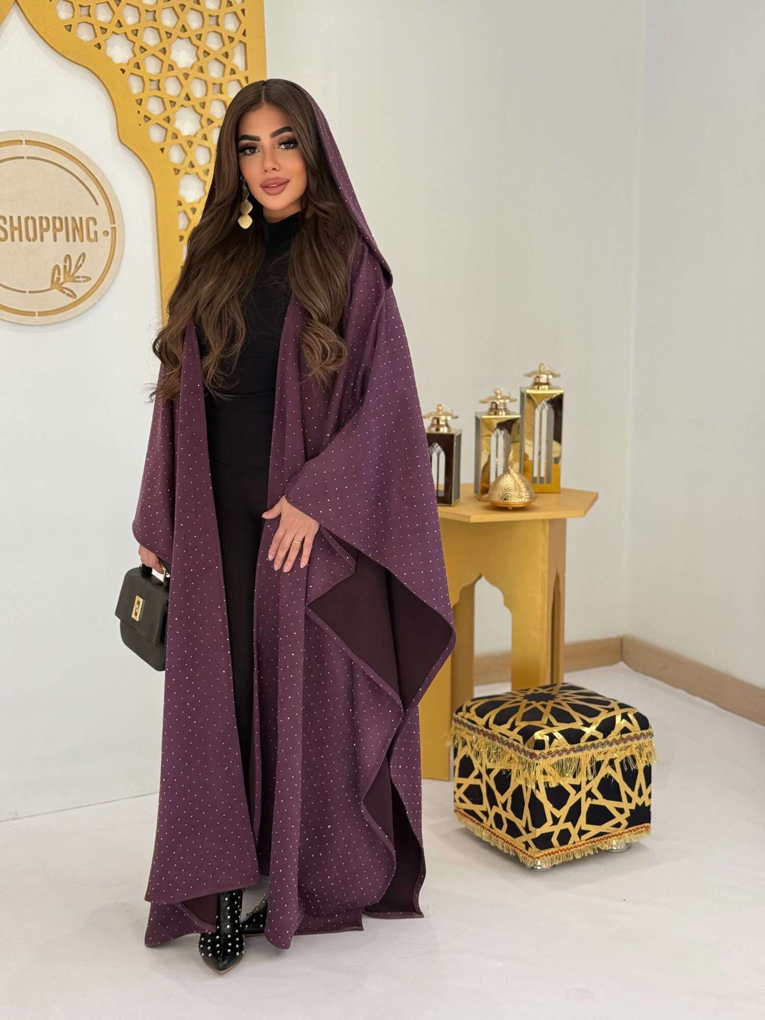 عباية سوداء فاخرة مزينة بنقاط استراس ناعمة تضيف لمسة من اللمعان الراقي دون مبالغة.