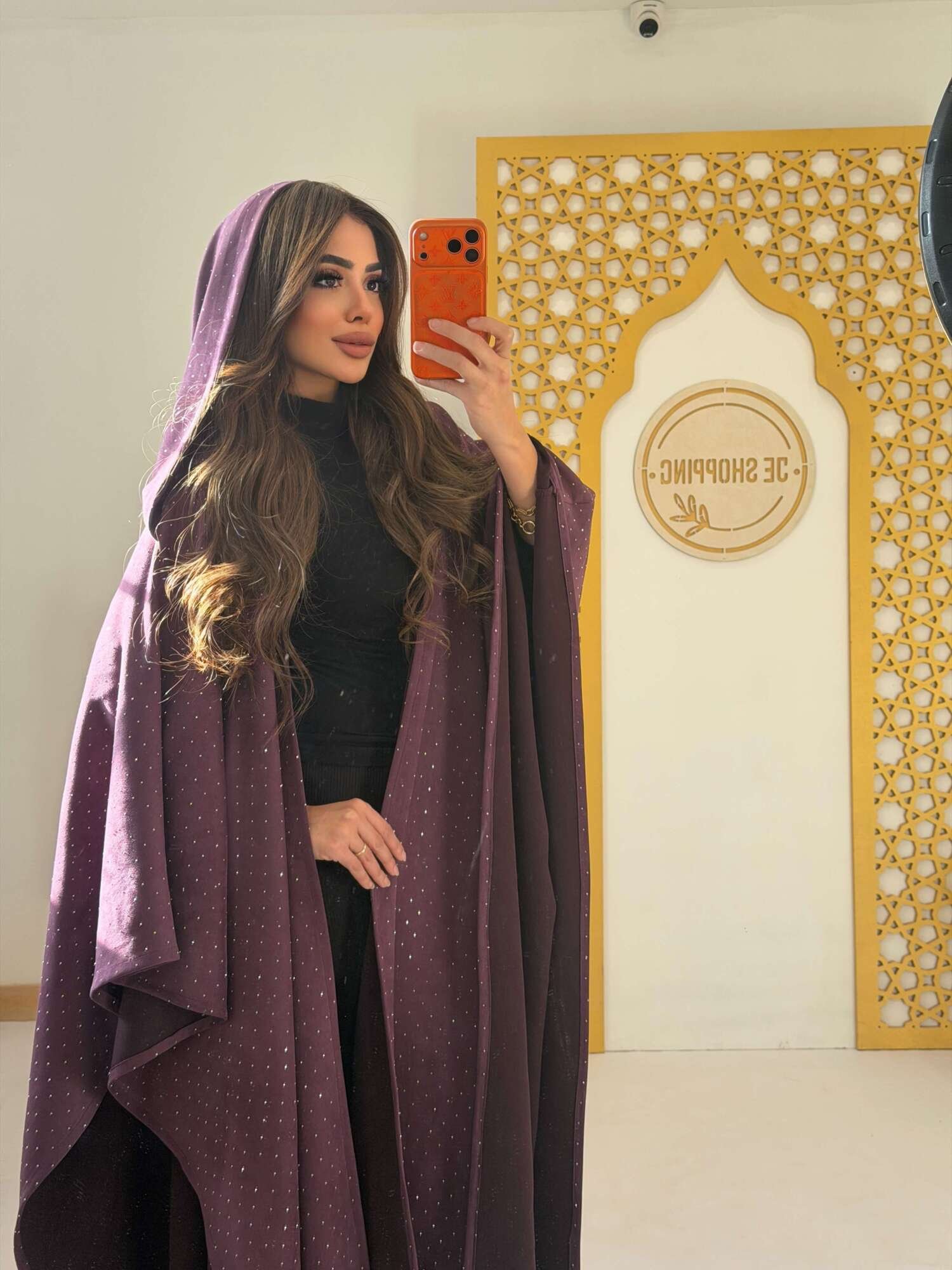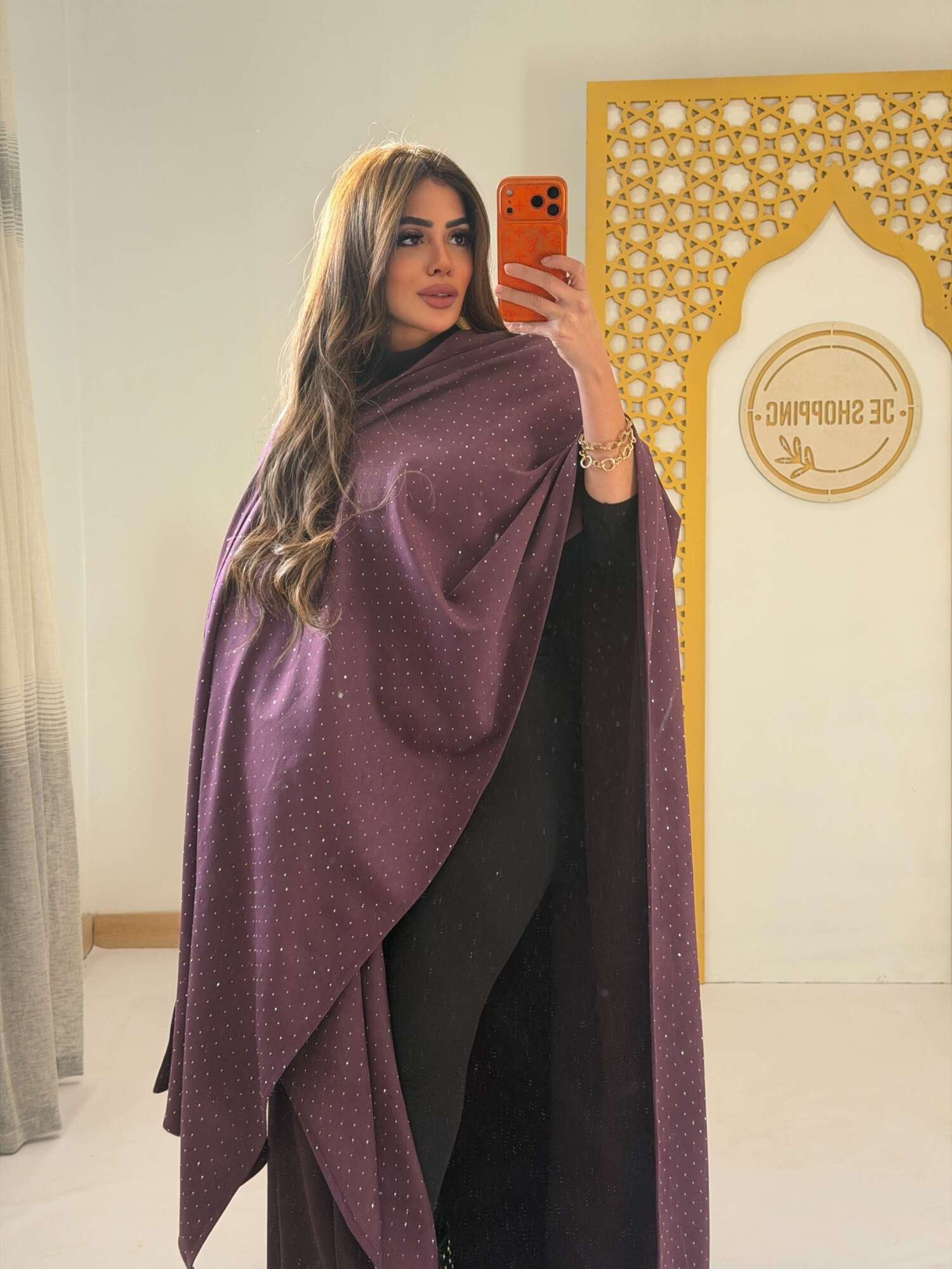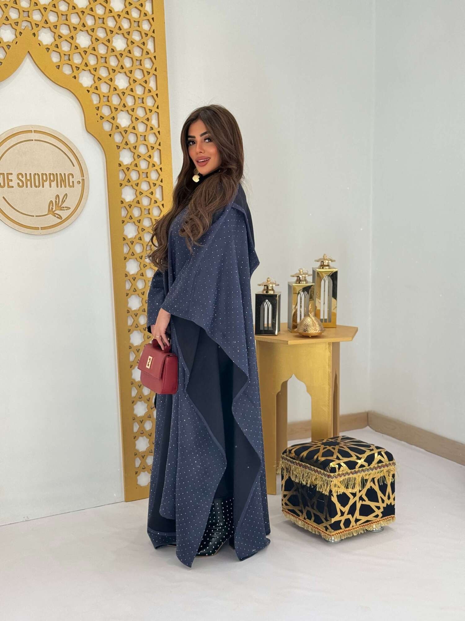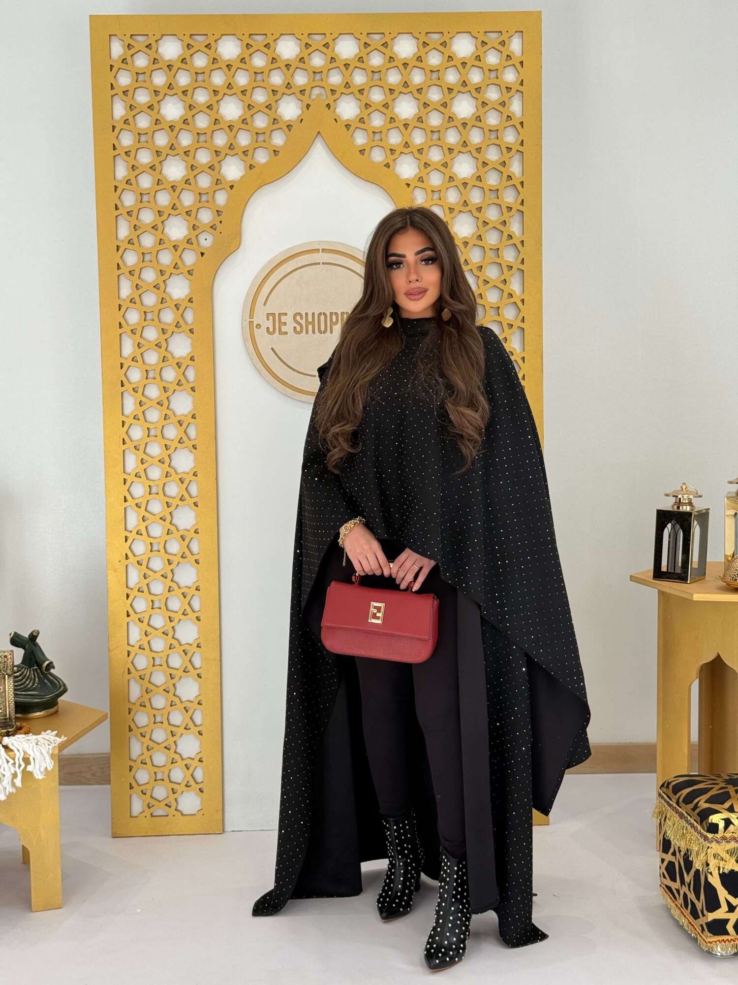 عباية سوداء فاخرة مزينة بنقاط استراس ناعمة تضيف لمسة من اللمعان الراقي دون مبالغة.