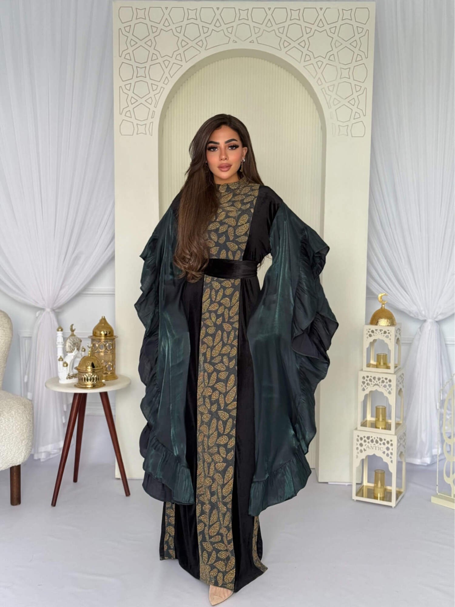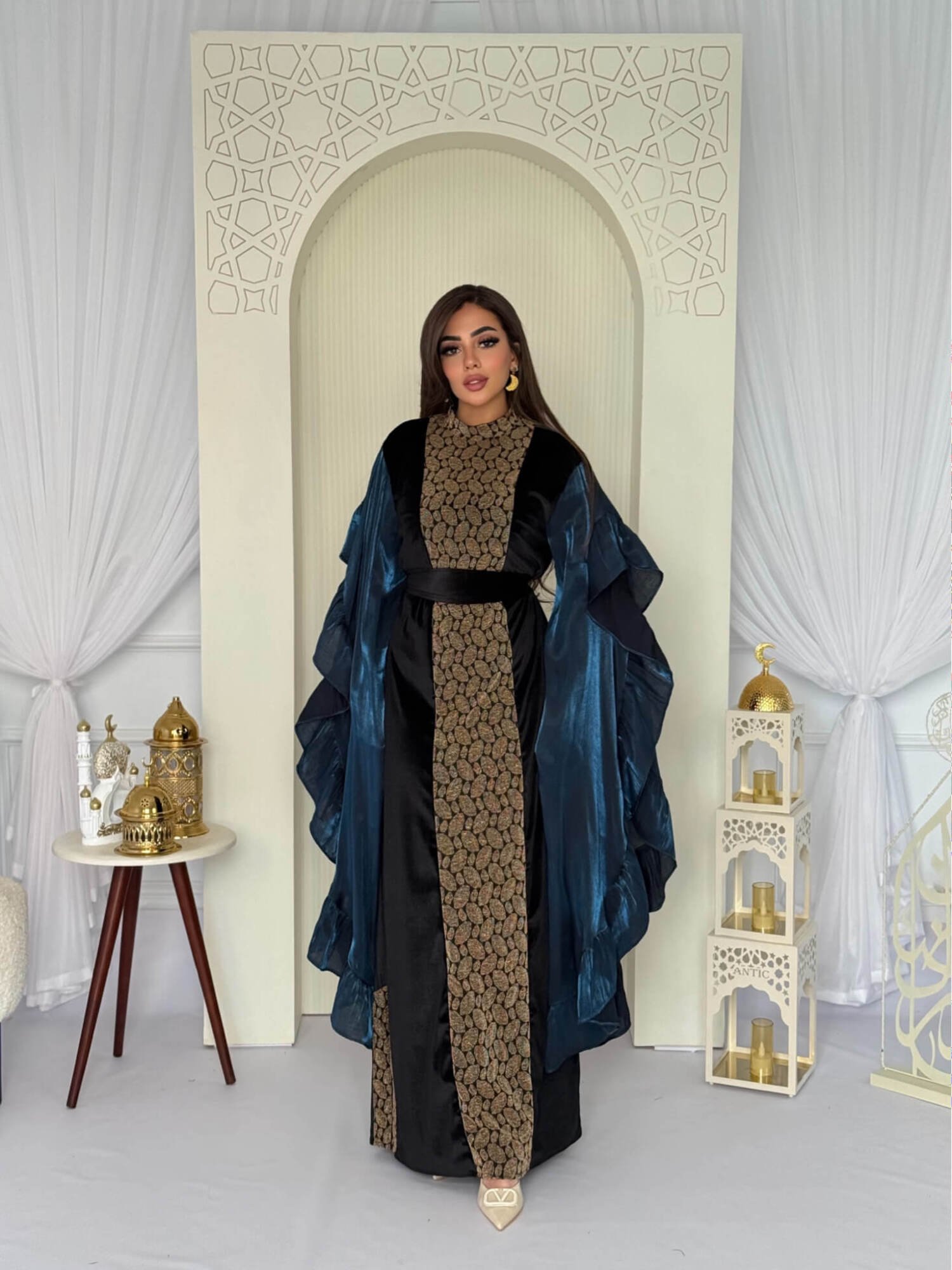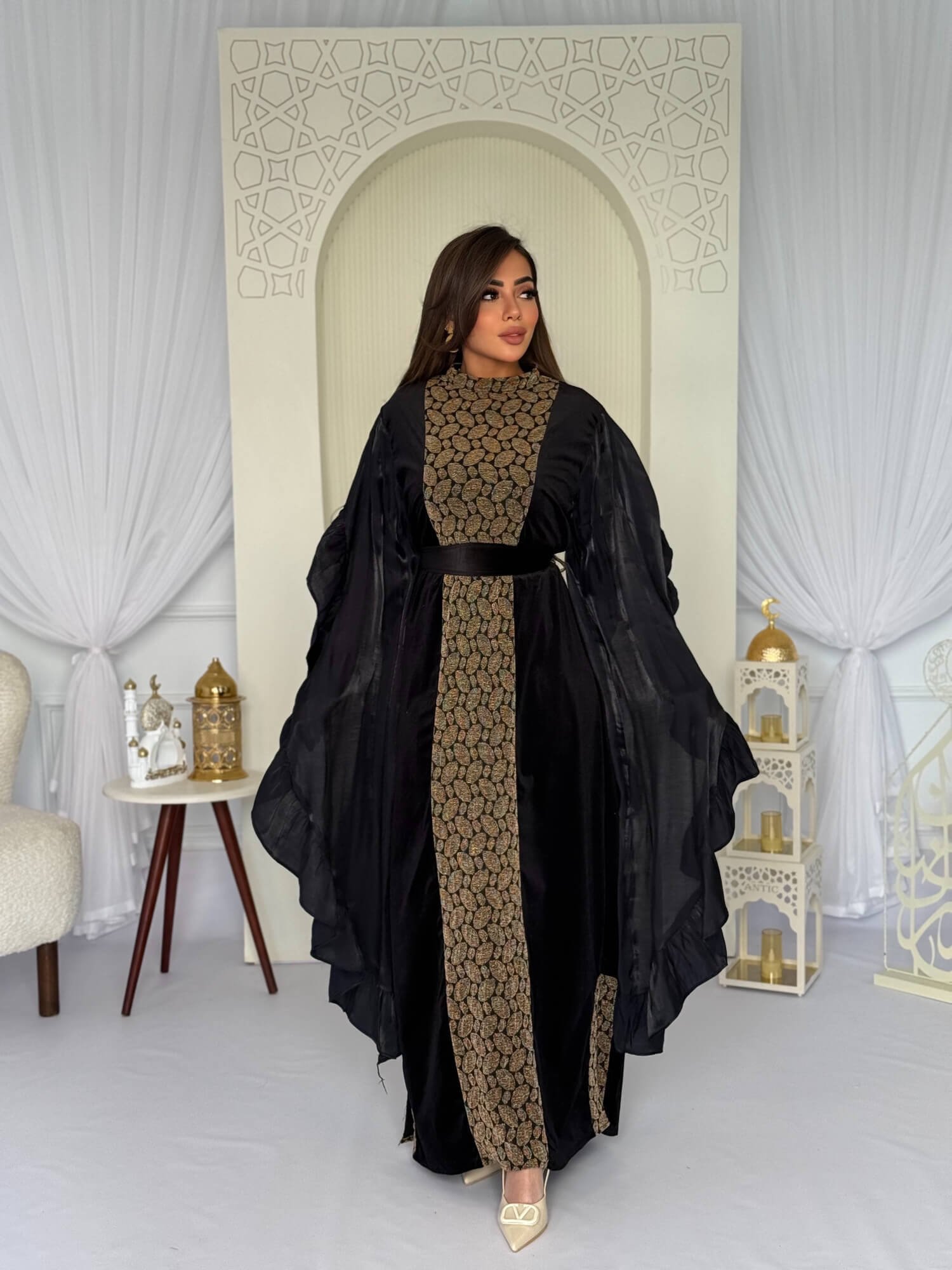 A statement abaya designed with a refined oriental aesthetic, featuring an elegant central pattern and wide layered sleeves that create graceful movement. Crafted from soft, flowing fabric for a luxurious feel and all-day comfort. Perfect for Ramadan evenings and special occasions, offering a powerful presence with timeless sophistication.