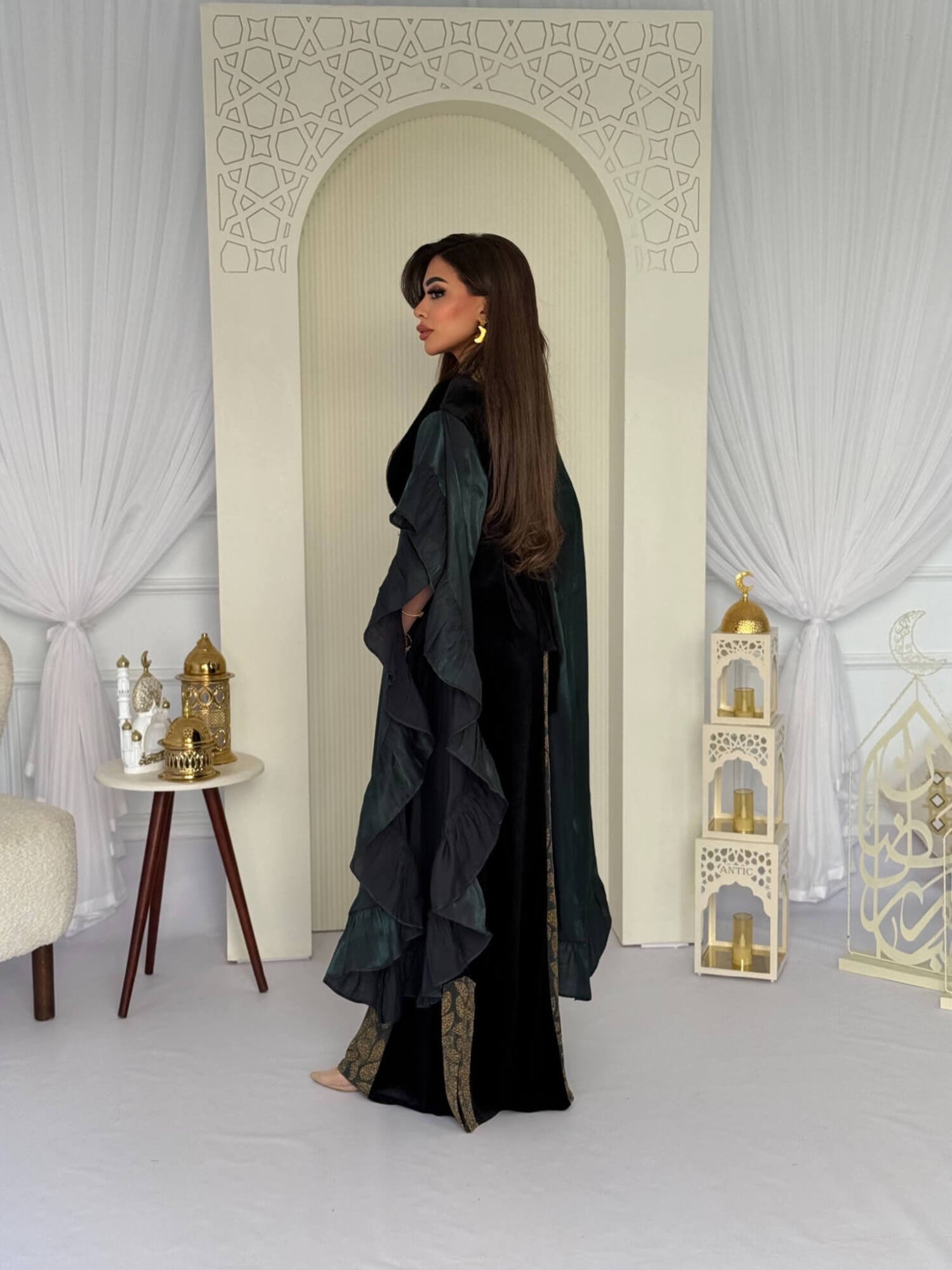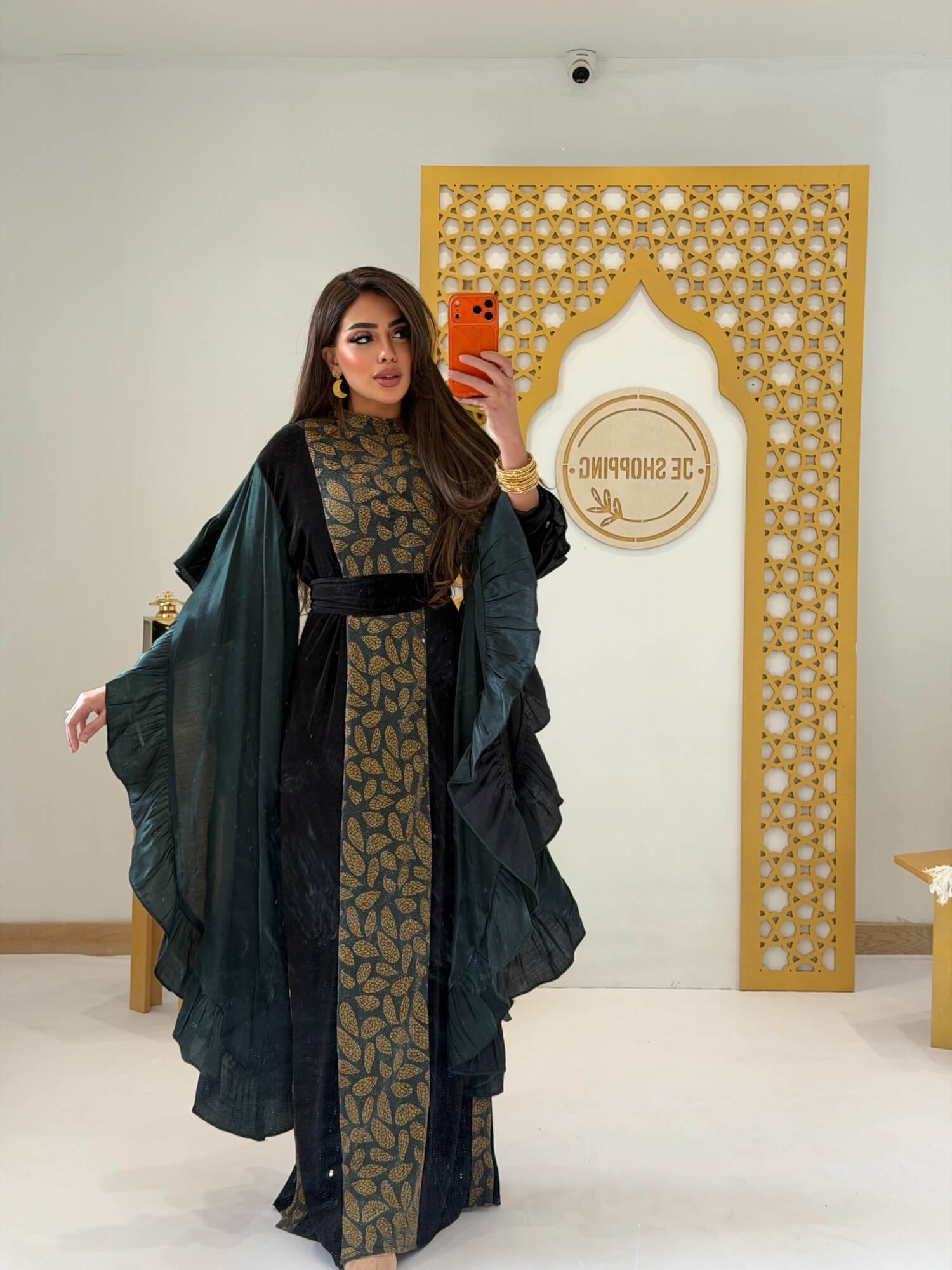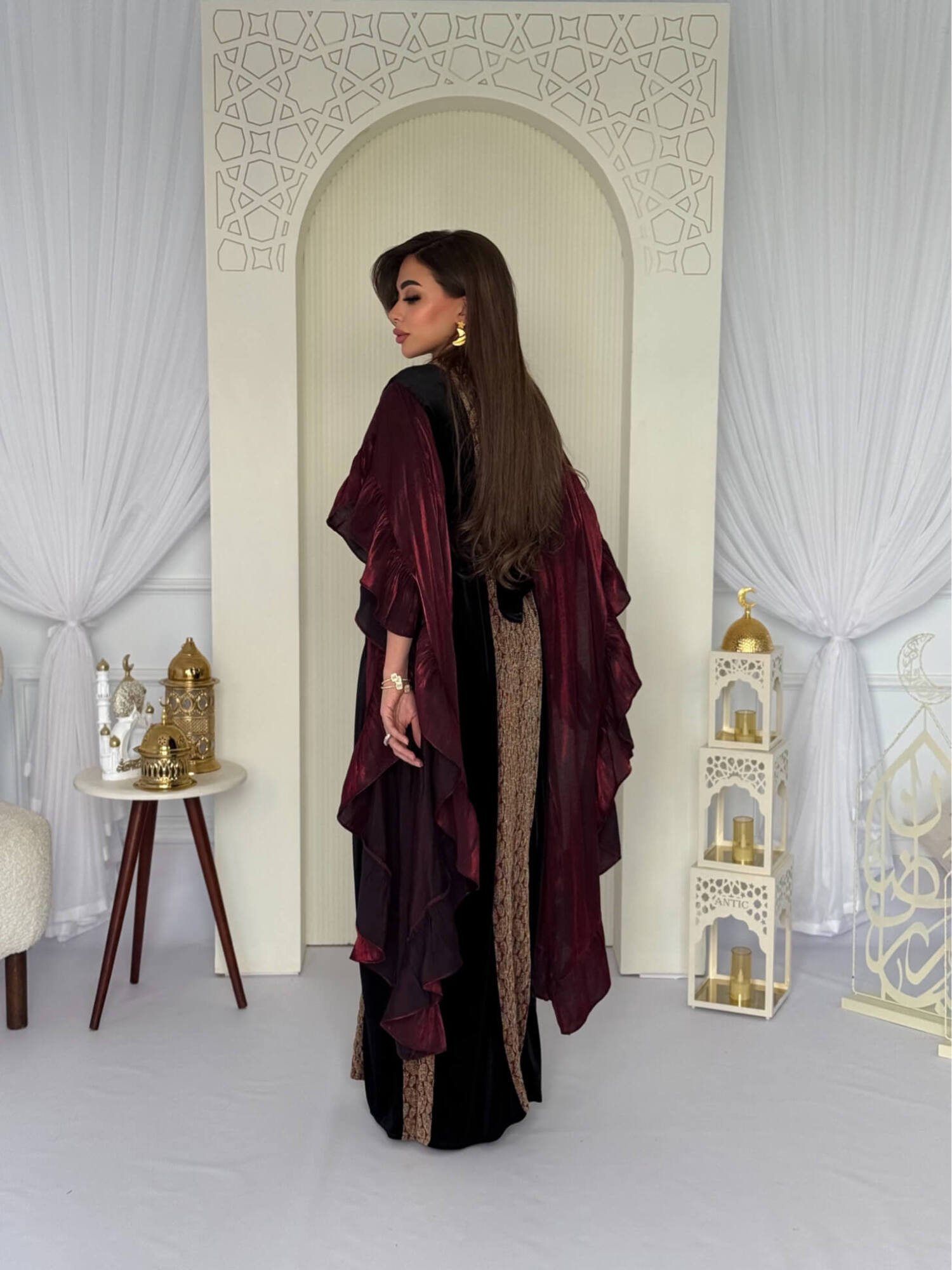 A statement abaya designed with a refined oriental aesthetic, featuring an elegant central pattern and wide layered sleeves that create graceful movement. Crafted from soft, flowing fabric for a luxurious feel and all-day comfort. Perfect for Ramadan evenings and special occasions, offering a powerful presence with timeless sophistication.