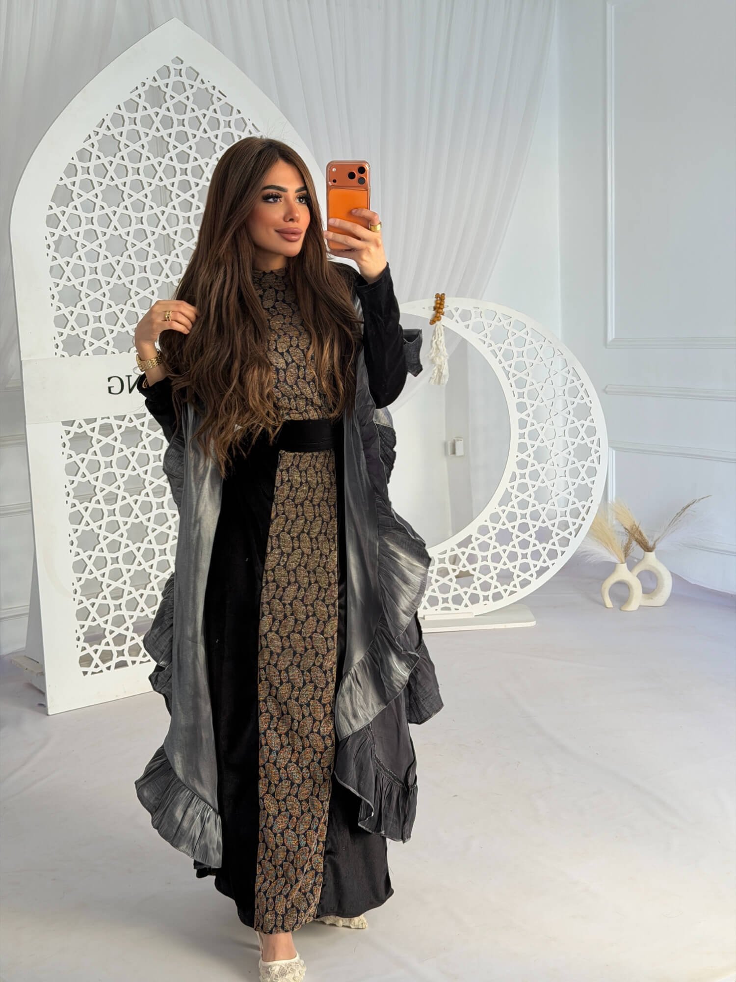 A statement abaya designed with a refined oriental aesthetic, featuring an elegant central pattern and wide layered sleeves that create graceful movement. Crafted from soft, flowing fabric for a luxurious feel and all-day comfort. Perfect for Ramadan evenings and special occasions, offering a powerful presence with timeless sophistication.