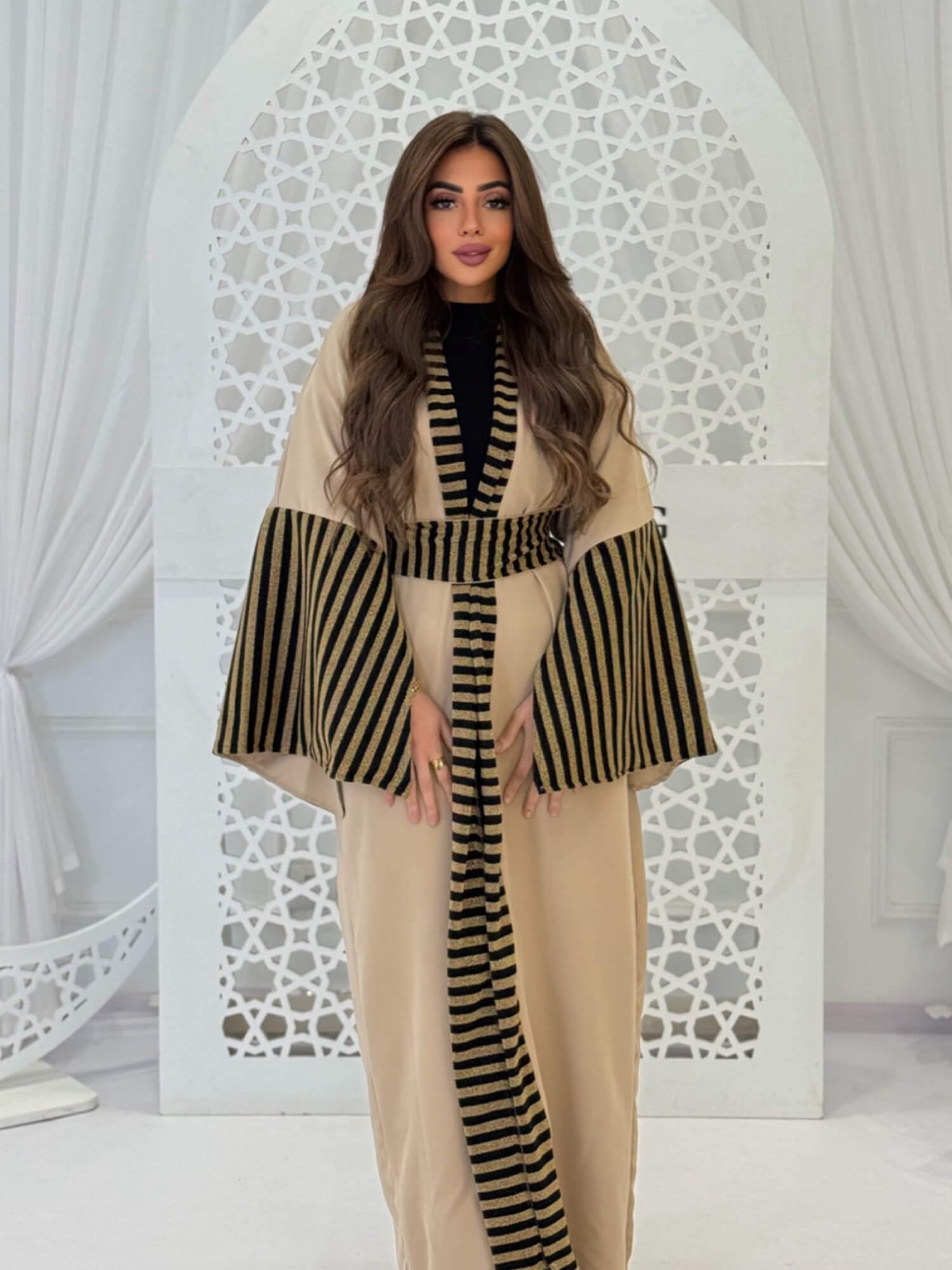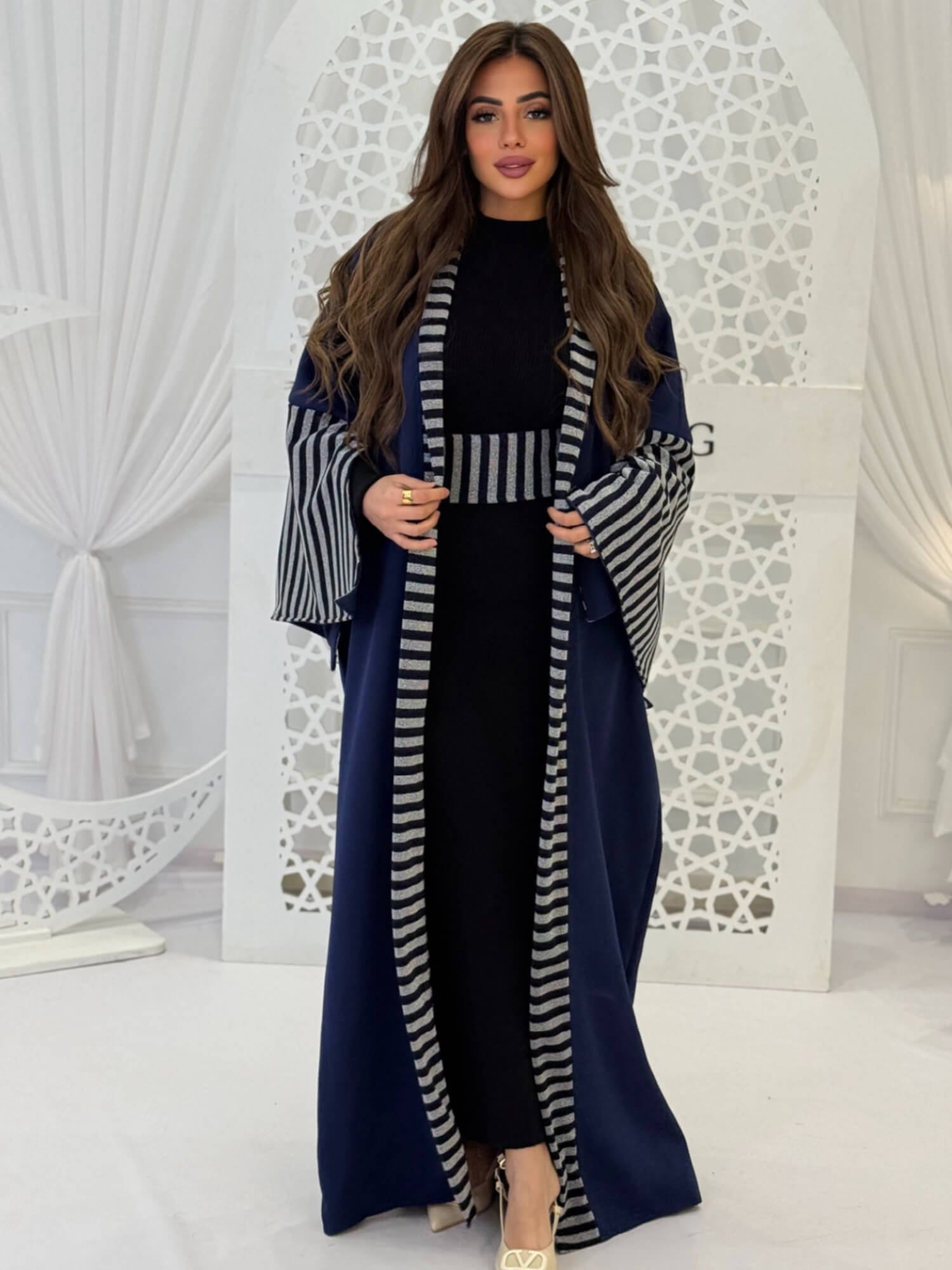 A long, flowing cardigan designed with refined striped details for a sophisticated look. Features wide sleeves and a relaxed fit, perfect for Ramadan gatherings and evening occasions. Easy to style and effortlessly elegant.