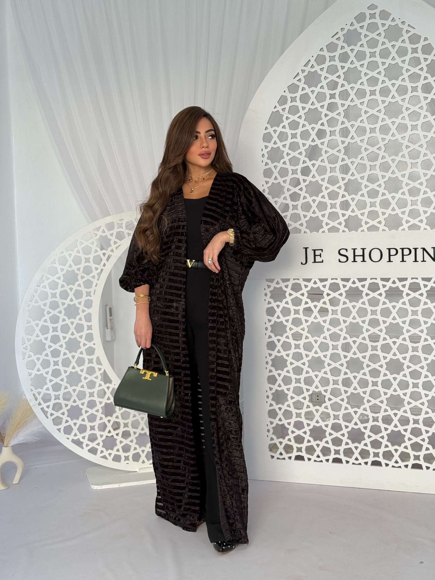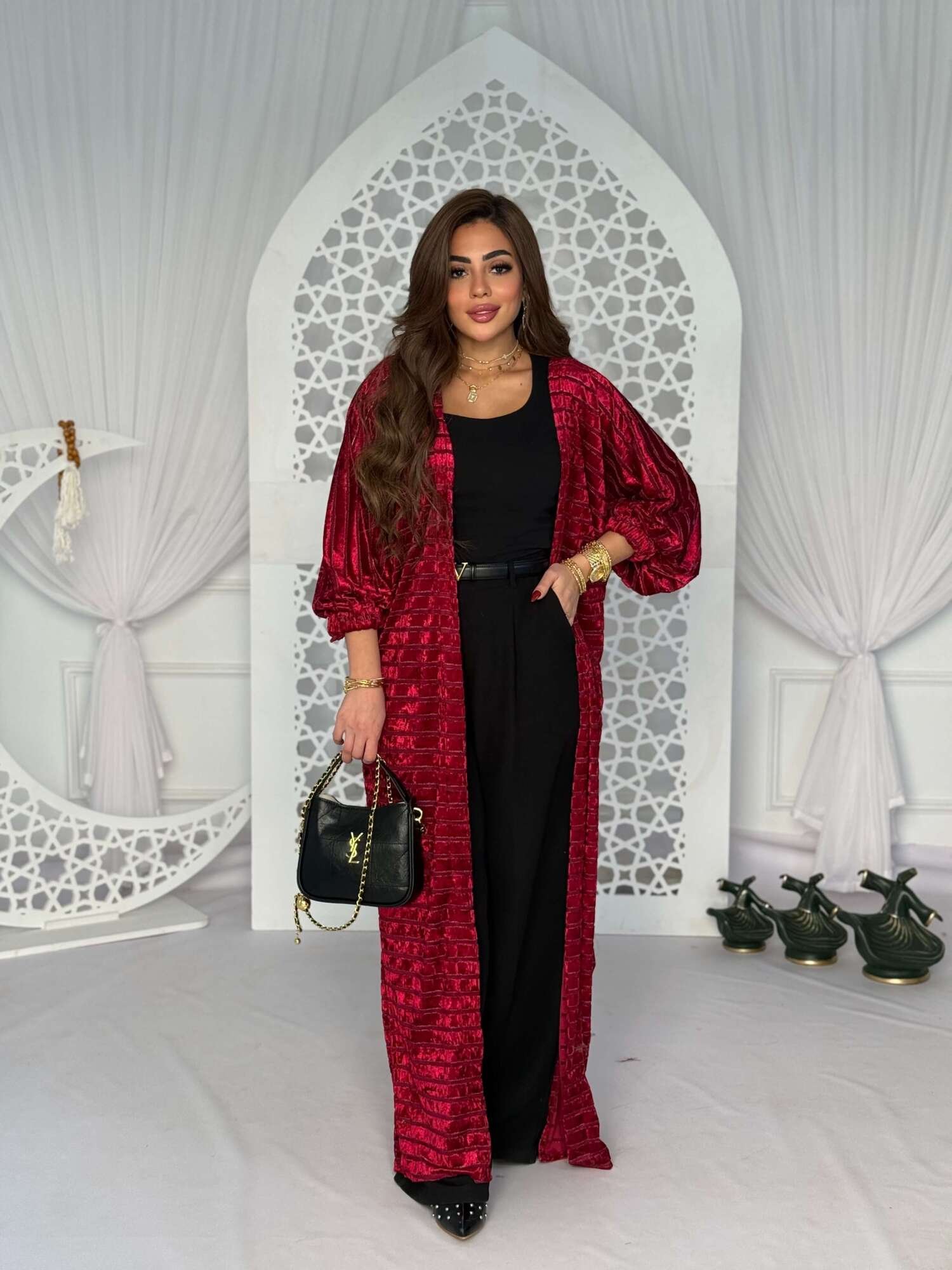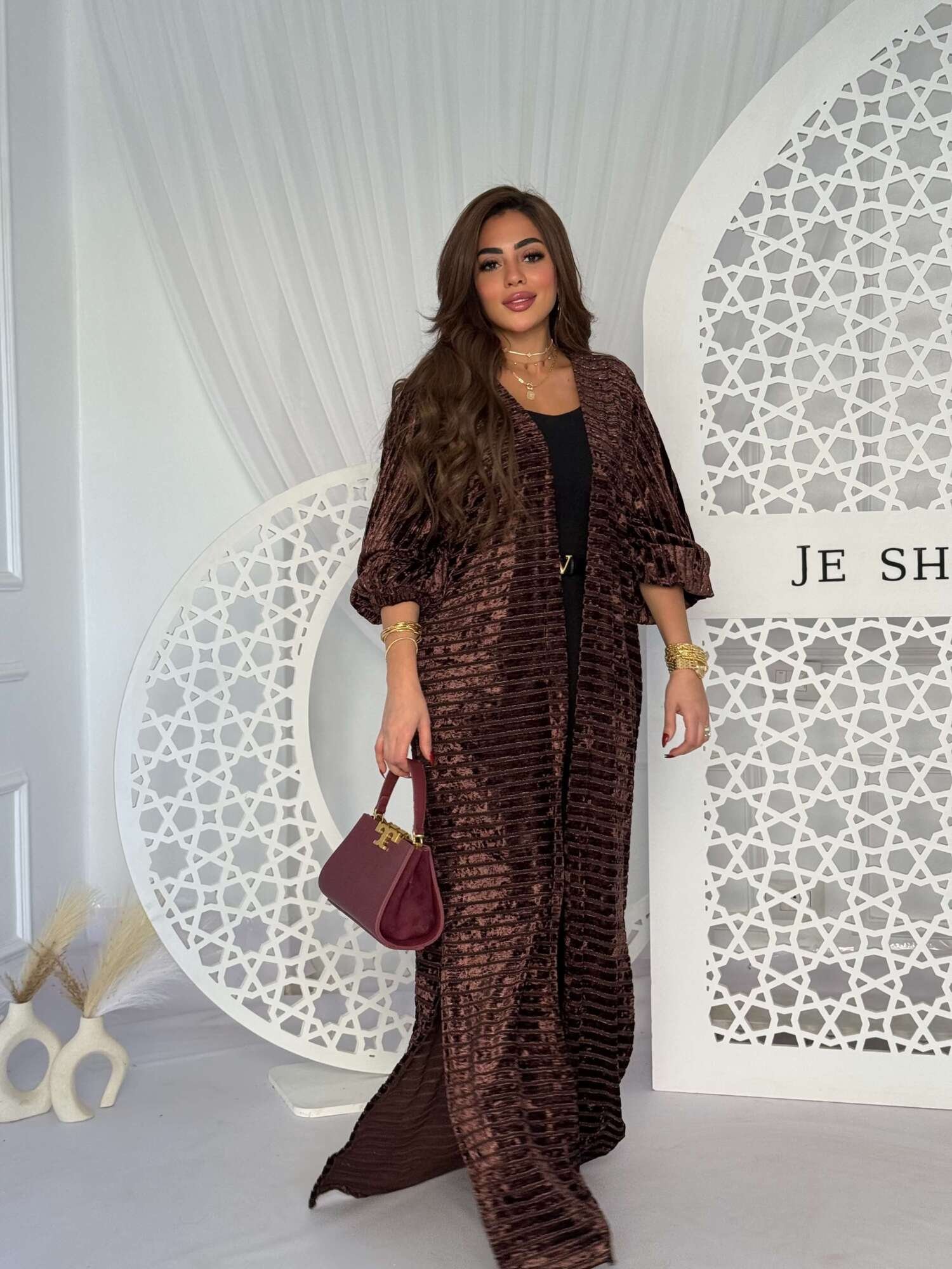 A luxurious long cardigan designed to stand out effortlessly. Crafted from soft velvet fabric with a subtle sheen that adds warmth and sophistication. It features a relaxed, flowing silhouette with elegant sleeves for a refined feminine look.