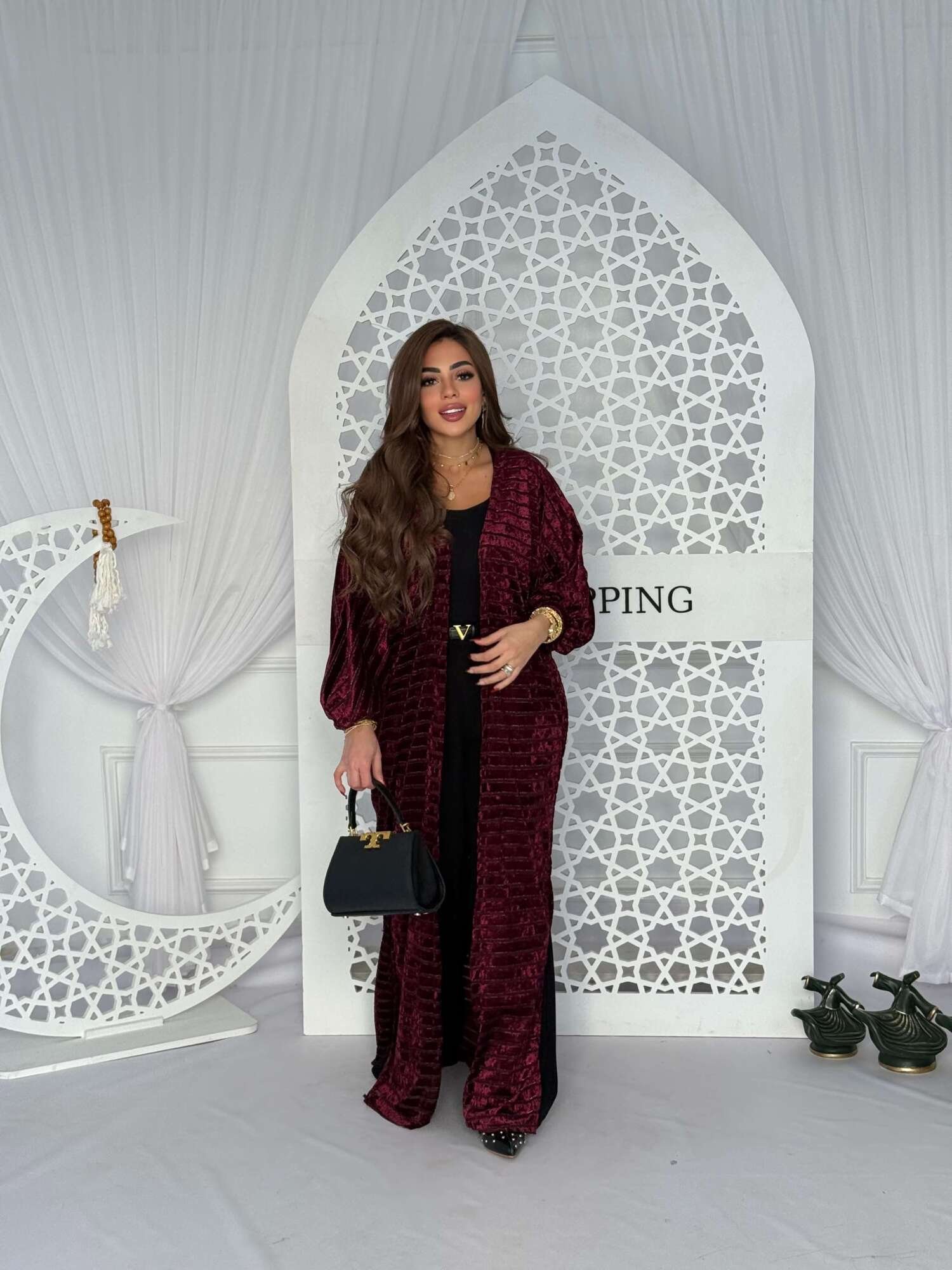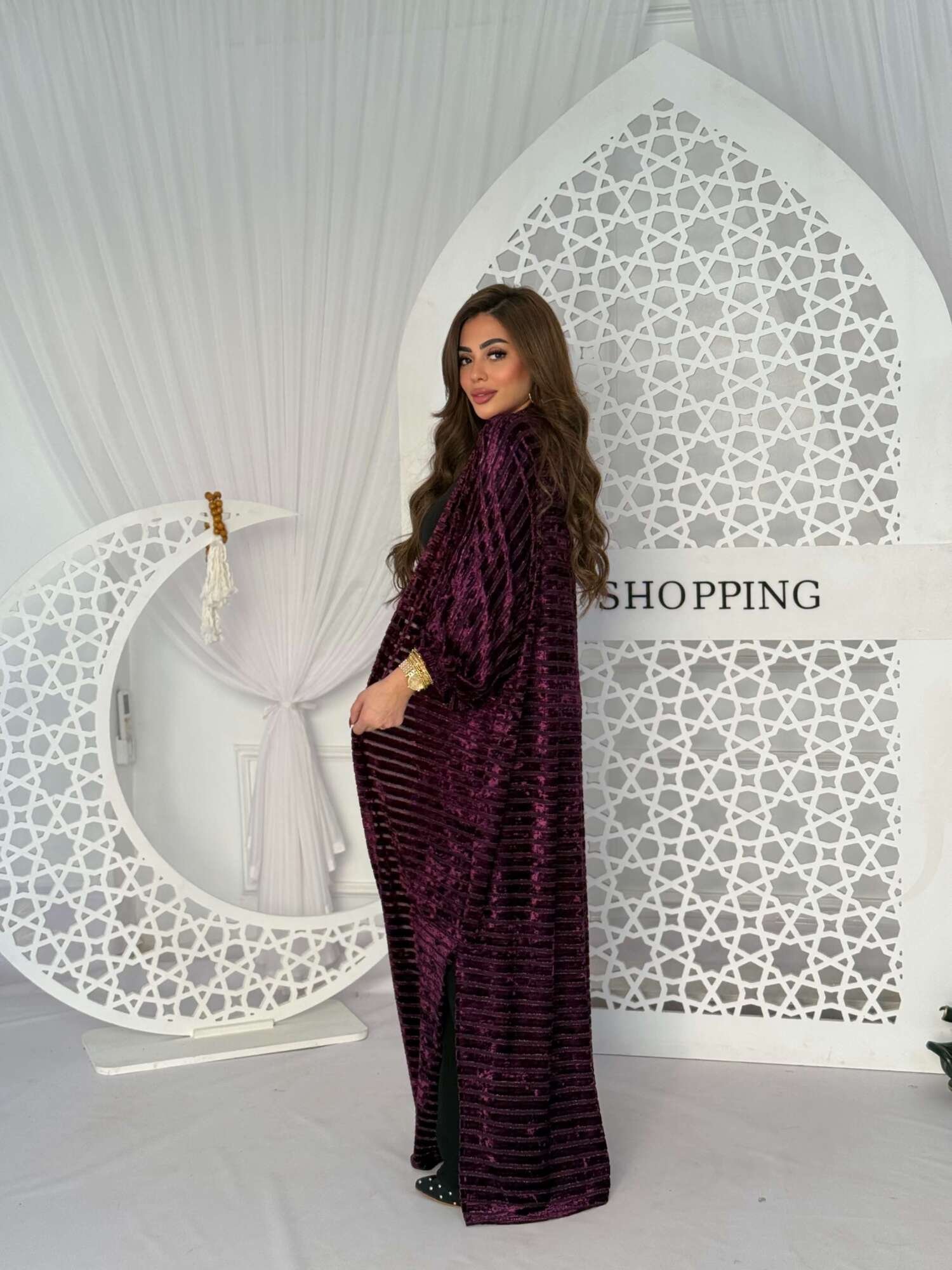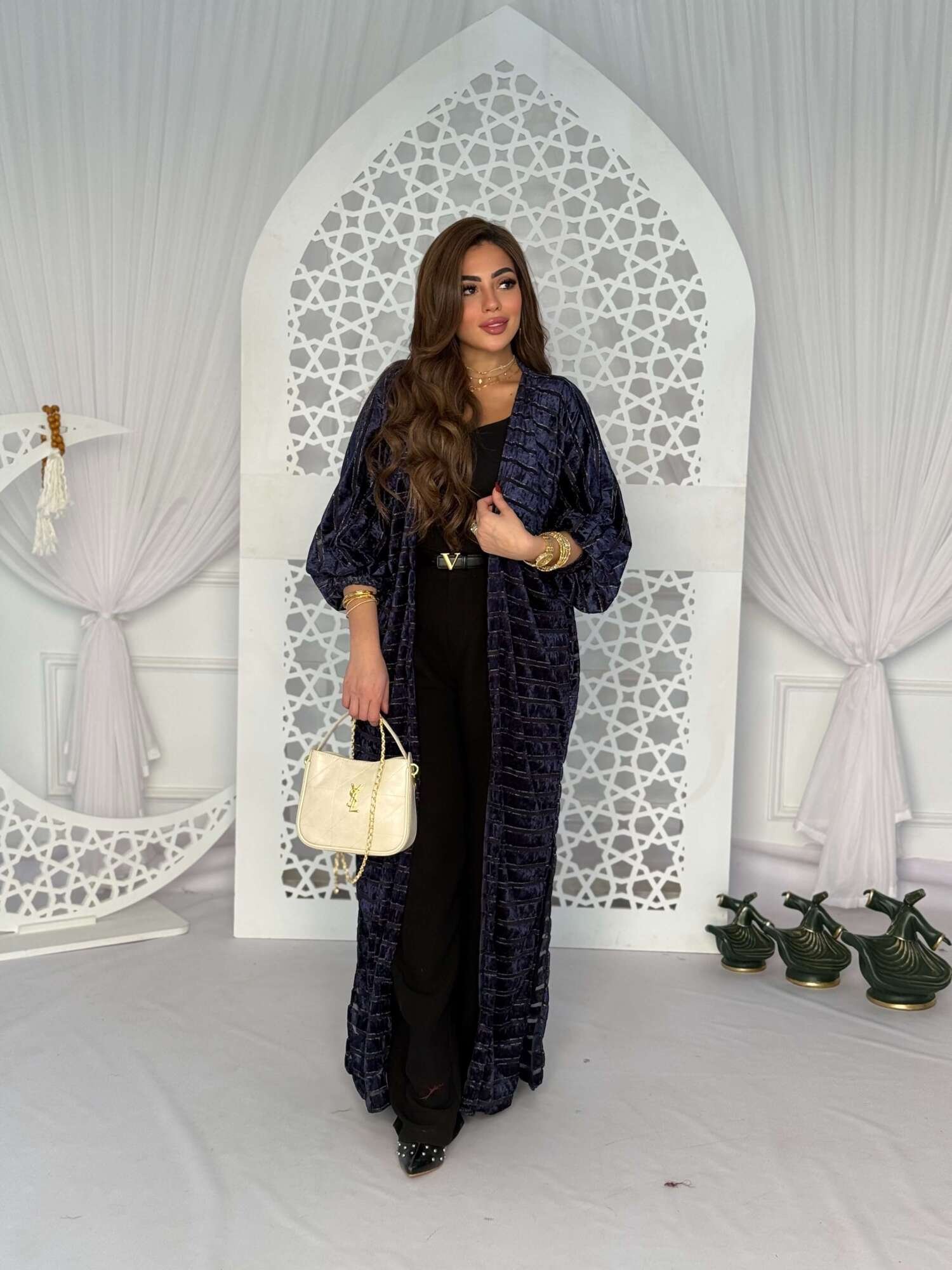 A luxurious long cardigan designed to stand out effortlessly. Crafted from soft velvet fabric with a subtle sheen that adds warmth and sophistication. It features a relaxed, flowing silhouette with elegant sleeves for a refined feminine look.