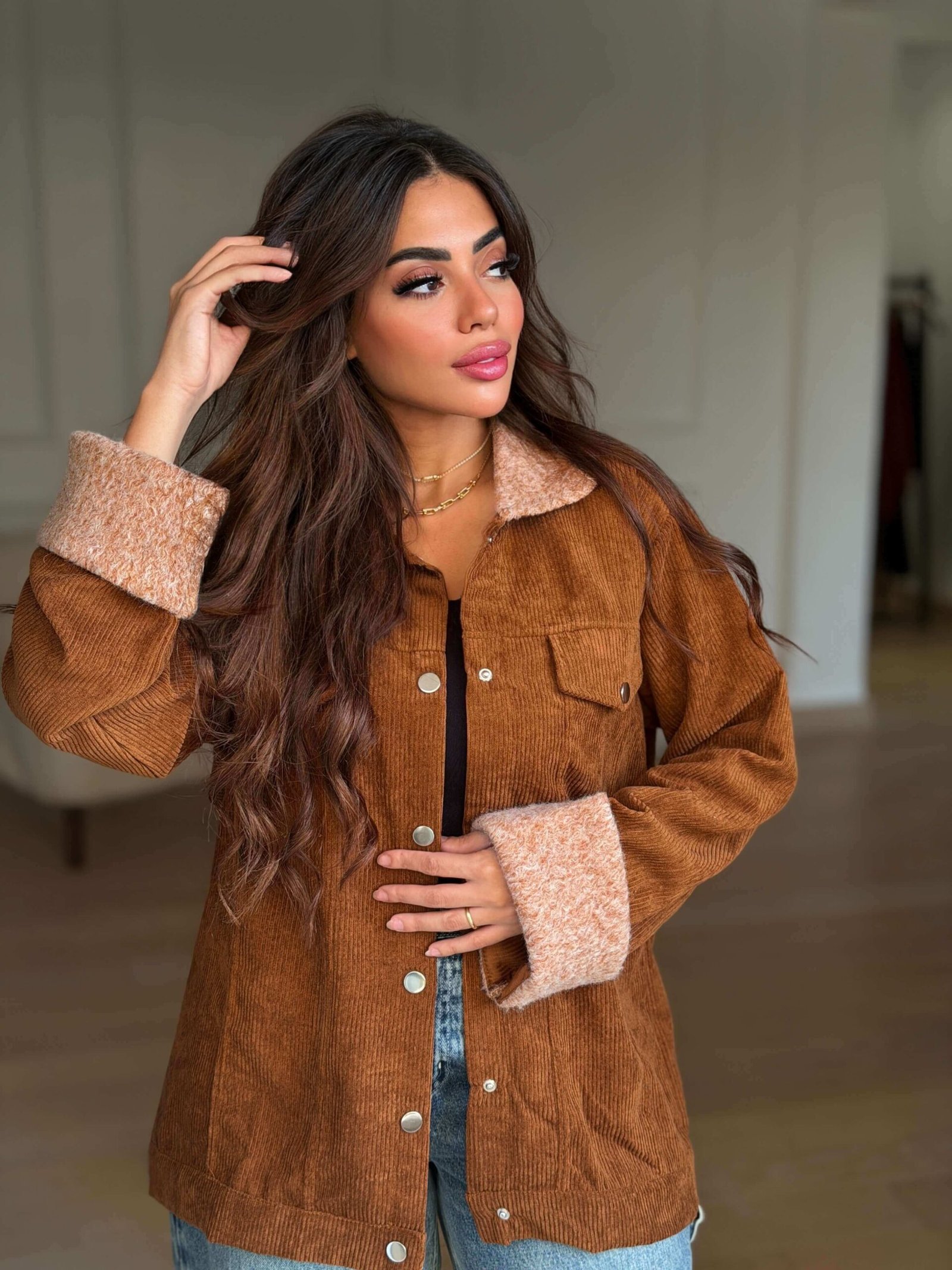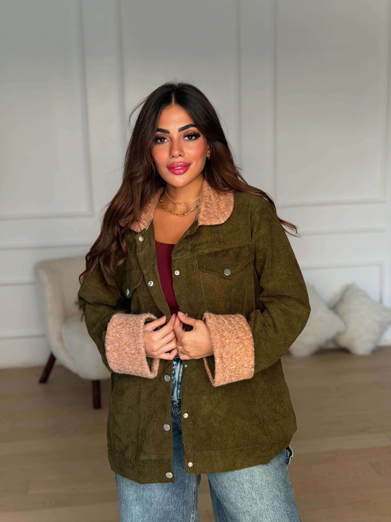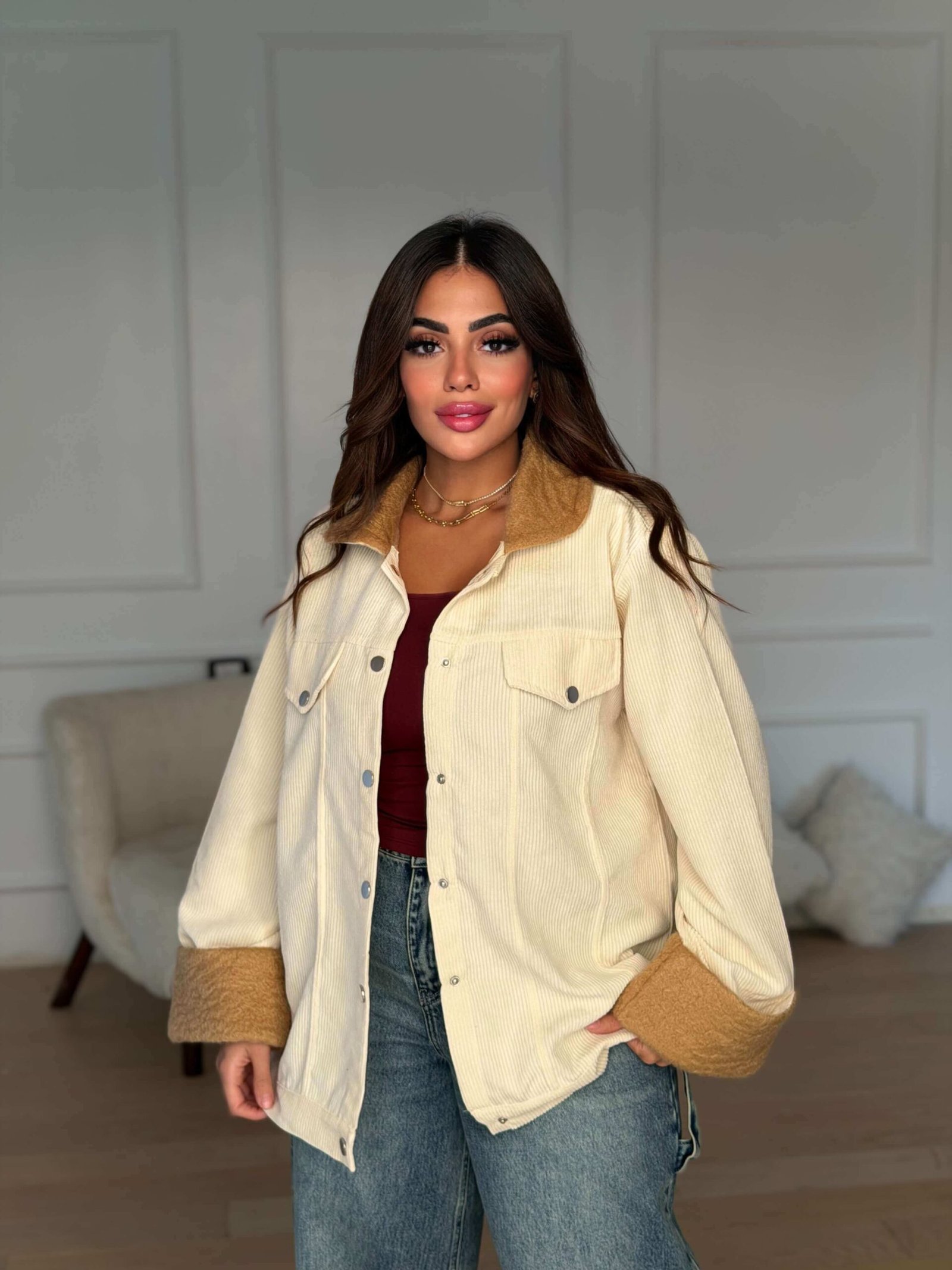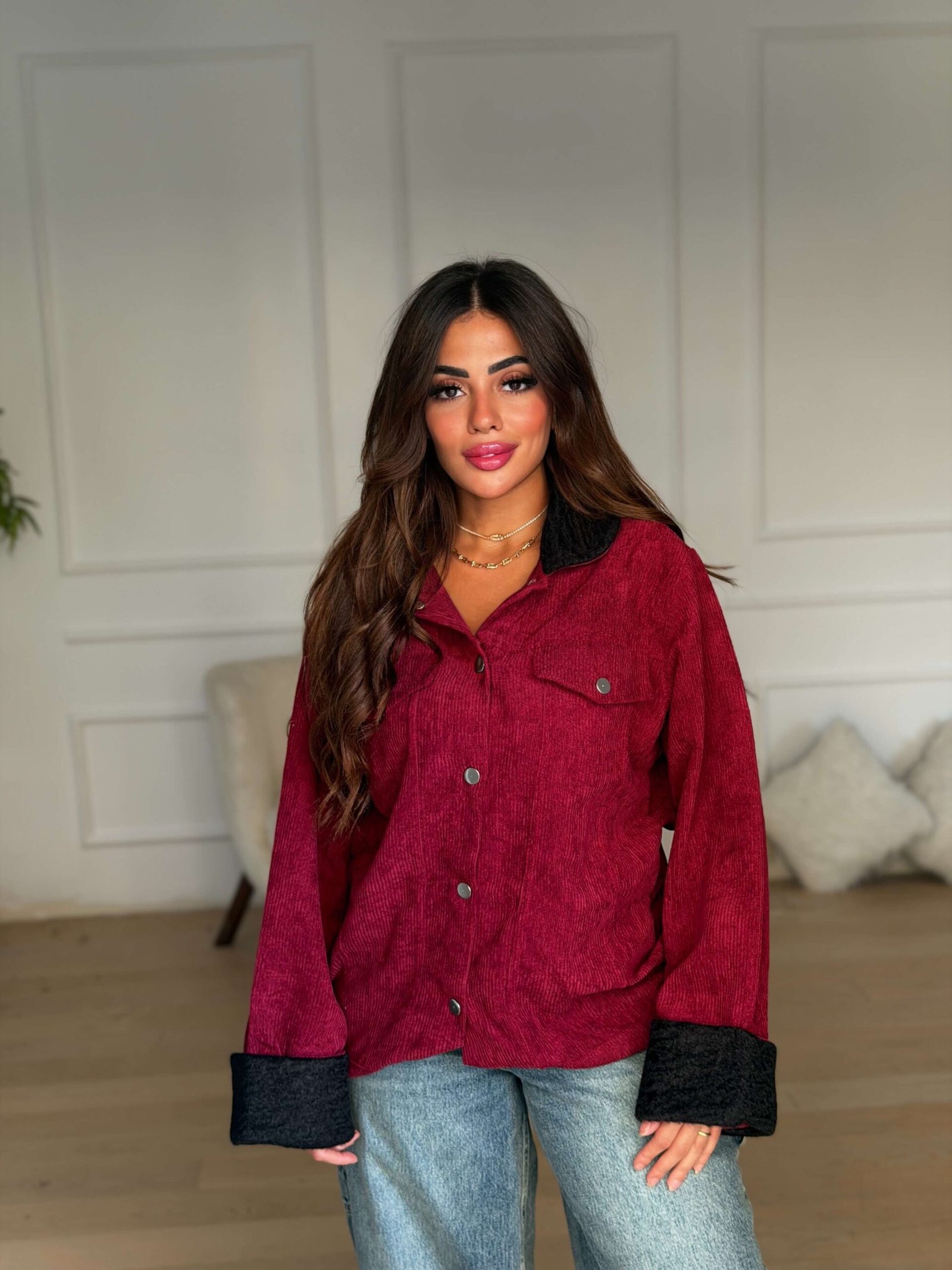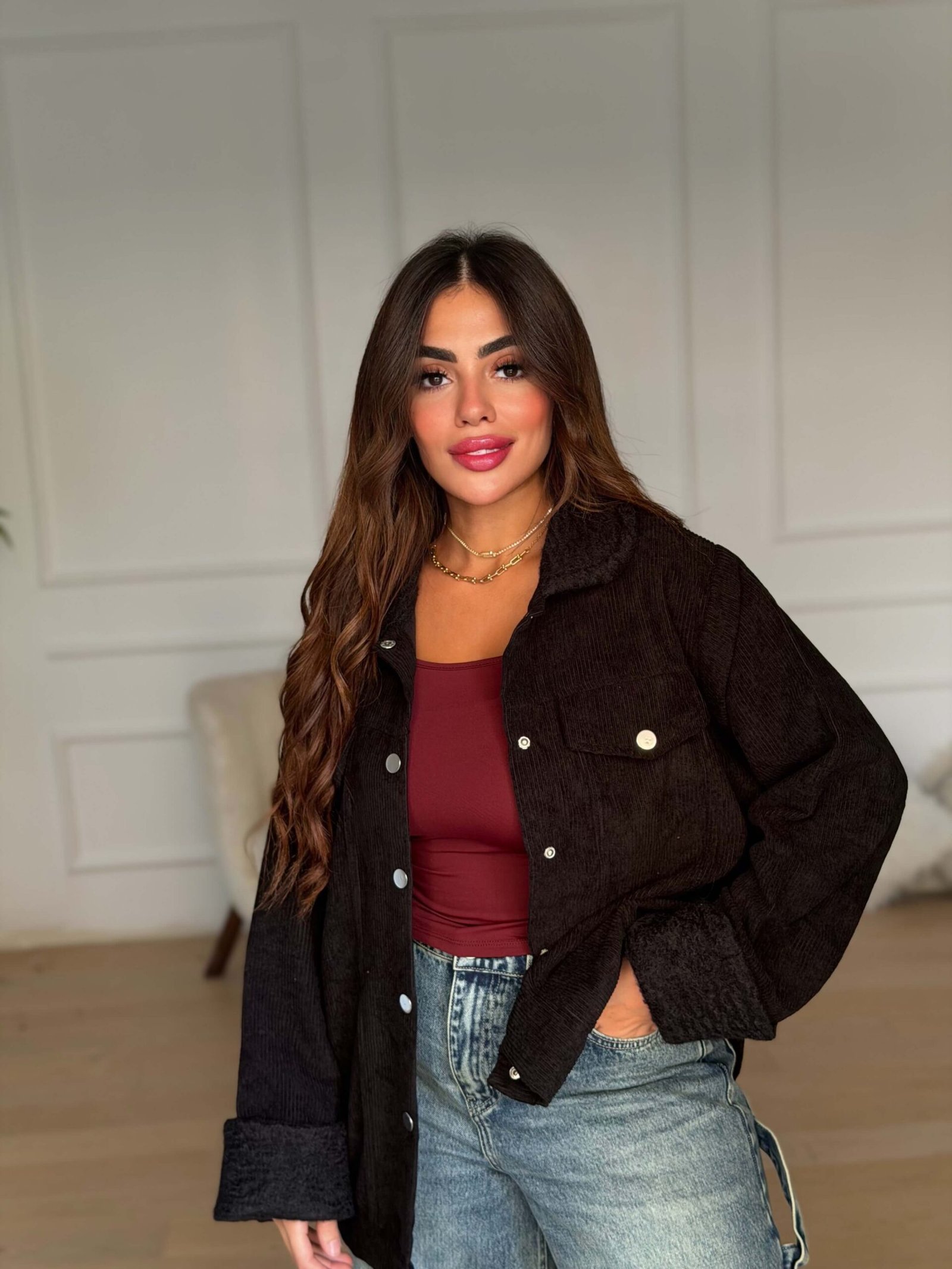 Stay effortlessly stylish with this ribbed velvet jacket featuring a soft, textured finish and a cozy inner lining. Designed with a relaxed fit, button-down front, and turn-up cuffs for a chic and comfortable look. Perfect for layering over your favorite tops or dresses during cool seasons, offering both warmth and a touch of modern elegance.