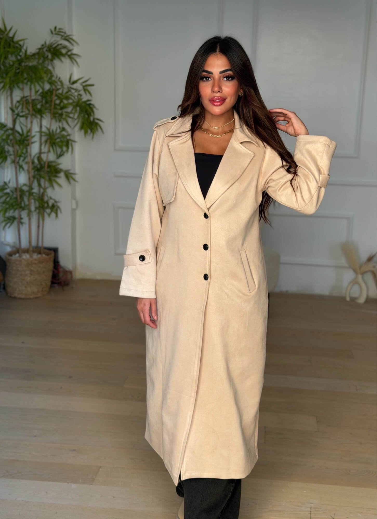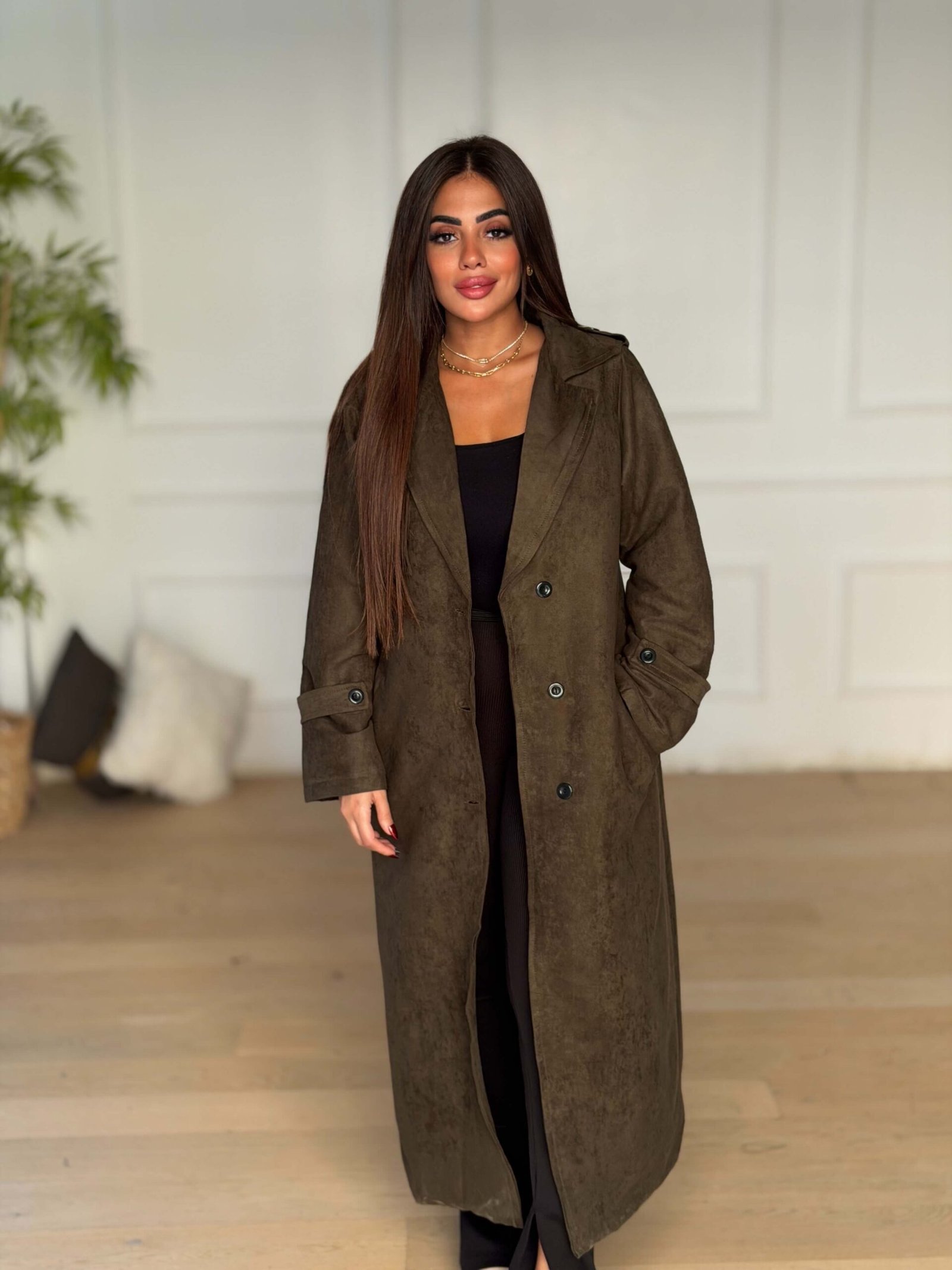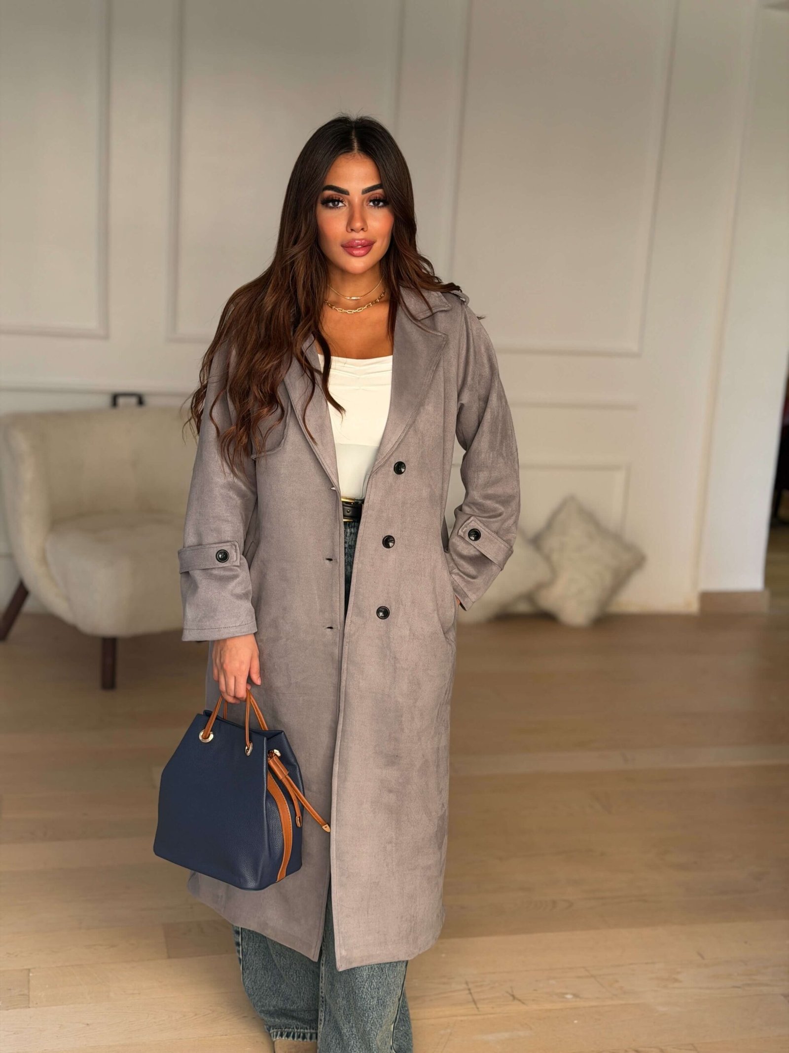 Step up your style with this premium suede trench coat, crafted with a smooth luxurious feel and a modern straight-cut silhouette. Designed for versatility — perfect for casual daytime looks or chic evening outfits. Features double-breasted buttons and refined sleeve details for an elevated finish. The neutral gray tone makes it a timeless wardrobe essential you can pair effortlessly.